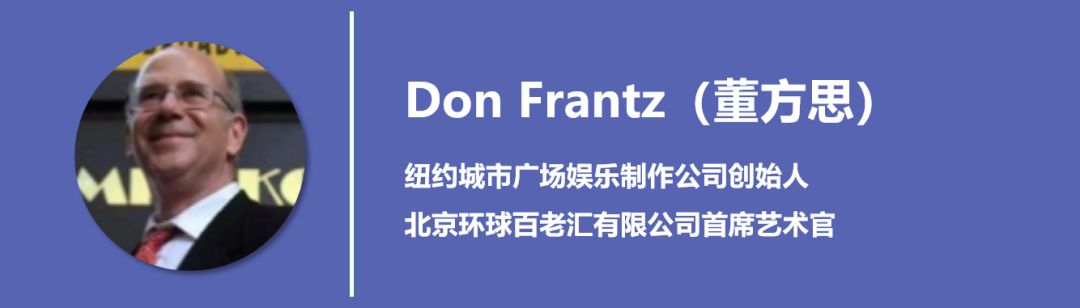 董方思(Don Frantz),纽约城市广场娱乐制作公司创始人。外百老汇音乐剧《幻灭》制作人。北京环球百老汇娱乐公司首席艺术官,李宗盛音乐剧项目执行制作人。百老汇《美女与野兽》(Beauty and the Beast)和《狮子王》(the Lion King)联合制作人。曾执导音乐剧《金陵十三钗》及《物理秀》。作为纽约倪德伦环球娱乐公司中国公司的首席执行官,曾负责《42街》在中国9个城市的巡演项目及《阿依达》的巡演。